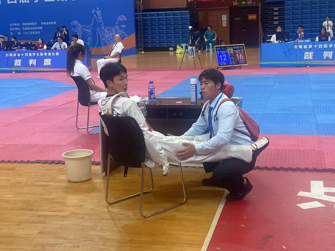 赛场上闪耀的奖牌背后,离不开学校领导及蒋恺主任的大力支持,以及教练团队的倾力付出。蒋恺主任为我们完善各种训练器材、为我们准备比赛服装,路伟杰老师和石海洋老师作为带队教练,从赛前数月便制定个性化训练计划,利用课余时间带领队员反复打磨技术动作,甚至在凌晨仍通过视频为选手分析战术。比赛期间,两位老师化身“全能守护者”——路伟杰老师在赛场旁为紧张的学生按摩放松,用幽默话语化解压力;石海洋老师则紧盯每一场比赛,通过手势暗号实时指导战术调整……